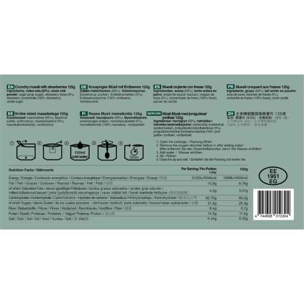 Συστατικά: Βρώμη σε ρολό (63%), πλήρες γάλα σε σκόνη, σιρόπι ζάχαρης (ζάχαρη), φέτες φράουλας (5%), συμπύκνωμα φράουλας (100% φράουλα), ζάχαρη βανίλιας.