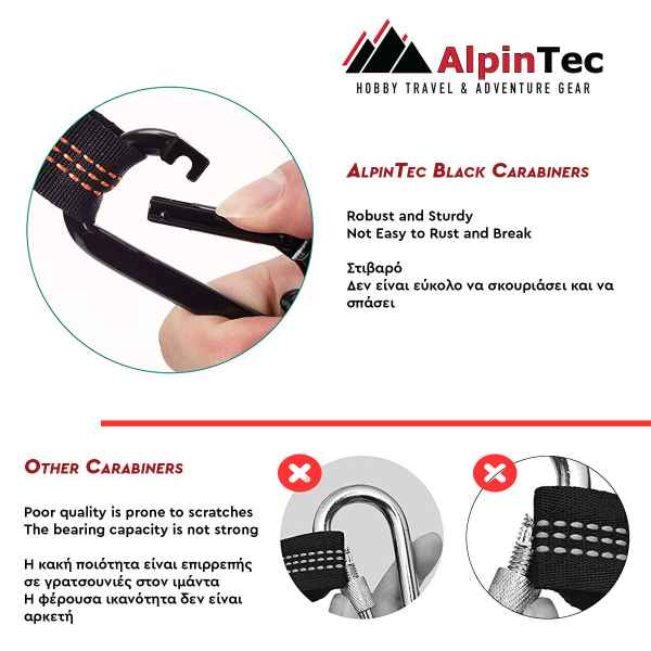 Καραμπίνερ: η αιώρα είναι εξοπλισμένη με 2 καραμπίνερ υψηλής ποιότητας με μέγεθος 8 x 80 mm, βάρος 63 g και χωρητικότητα φορτίου έως 300kg