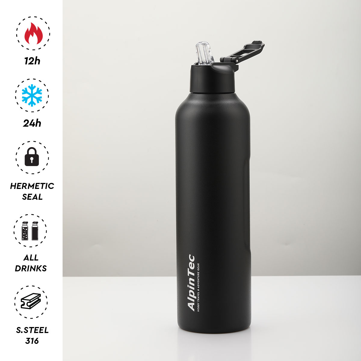 Μη-τοξικό, 100% στεγανό θερμός 950ml Tour της AlpinTec. Ασφαλές, xωρίς διαρροές με άνοιγμα με μια κίνηση. Διατήρηση θερμοκρασίας 12/24 ώρες. Διαθέτει και καλαμάκι.